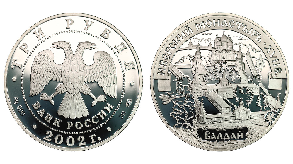 Серебро. 1,0 oz. 0,900. 34,88 г. "Иверский монастырь (XVII в.), Валдай". В оригинальной капсуле.
