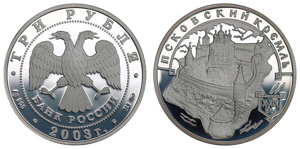 Серебро. 1,0 oz. 0,900. 34,88 г. "Псковский Кремль. X-XIX вв.". В оригинальной капсуле.