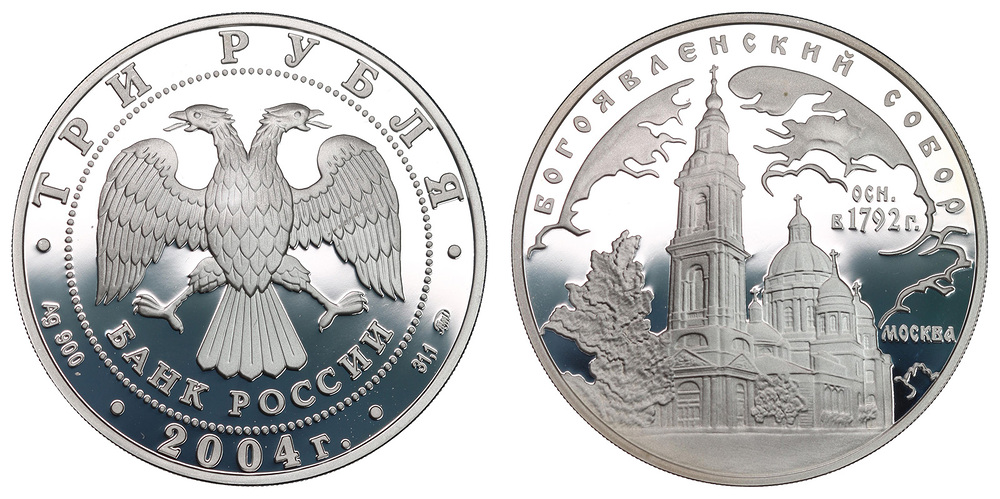 Серебро. 1,0 oz. 0,900. 34,88 г. "Богоявленский собор (XVIII в.), г. Москва". В оригинальной капсуле.