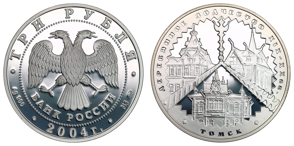 Серебро. 1,0 oz. 0,900. 34,88 г. "Деревянное зодчество (XIX-XX вв.), г. Томск". В оригинальной капсуле.