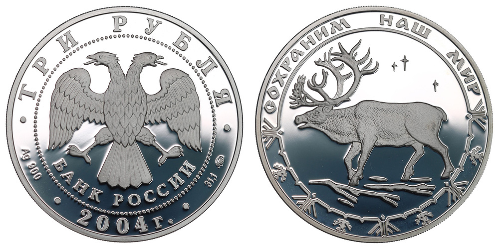 Серебро. 1,0 oz. 0,900. 34,88 г. "Сохраним наш мир. Северный олень.". В оригинальной капсуле.
