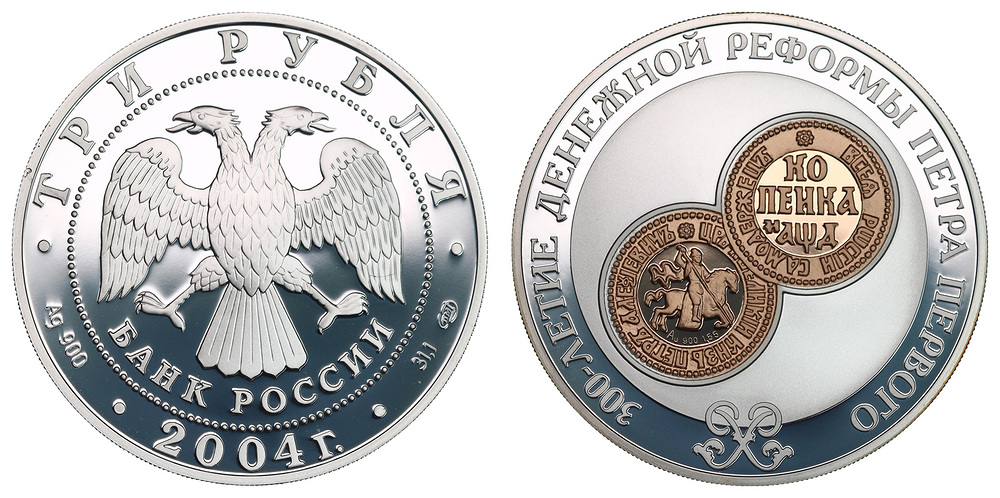 Золото. 0,05 oz. 0,900. 1,73 г. Серебро. 1,0 oz. 0,900. 35,0 г. "300-летие денежной реформы Петра I". В капсуле.