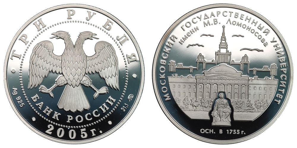 Серебро. 1,0 oz. 0,925. 33,94 г. "250-летие основания Московского государственного университета имени М.В. Ломоносова.". В оригинальной капсуле.