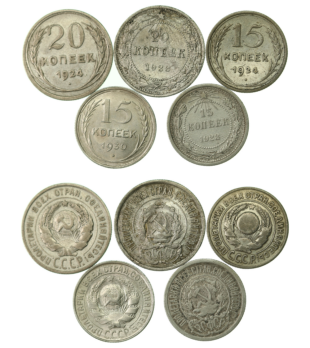 Серебро. 15 копеек 1923, 1924, 1930 года; 20 копеек 1923, 1924 года.