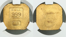 Редкий. Ленинградский монетный двор. Золото, 10,05 г. Федорин VI, Приложение, С. 495, 1. В слабе CPRC MS63. Наряду с производством монет на Ленинградском Монетном Дворе в 1925 году были отчеканены специальные золотые торговые восьмигранные слитки 999-й пробы с литерами «М Д». Предназначались они для реализации населению в период перехода к осуществлению новой экономической политики — НЭПу. Таких слитков было выпущено немногим более 150 тысяч штук. По весовой категории слитки подразделялись на три вида — 5 г, 10 г и 50 г.