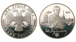 Очень редкая. Серебро, 96,7139 oz. 0,900. 3342 г. Санкт-Петербургский монетный двор. Диаметр: 130 мм. Тираж 150 экз. С сертификатом о подлинности № 0035. Первая монета подобного номинала и первый выпуск монеты, которая содержит 3 килограмма чистого серебра.