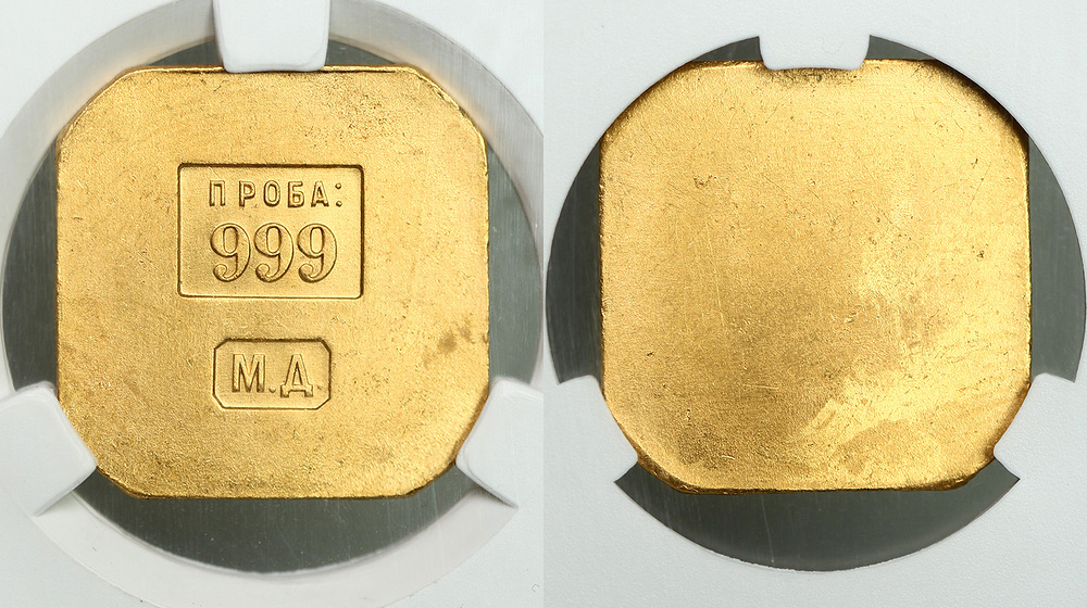 Редкий. Ленинградский монетный двор. Золото, 10,05 г. Федорин VI, Приложение, С. 495, 1. В слабе CPRC MS63. Наряду с производством монет на Ленинградском Монетном Дворе в 1925 году были отчеканены специальные золотые торговые восьмигранные слитки 999-й пробы с литерами «М Д». Предназначались они для реализации населению в период перехода к осуществлению новой экономической политики — НЭПу. Таких слитков было выпущено немногим более 150 тысяч штук. По весовой категории слитки подразделялись на три вида — 5 г, 10 г и 50 г.