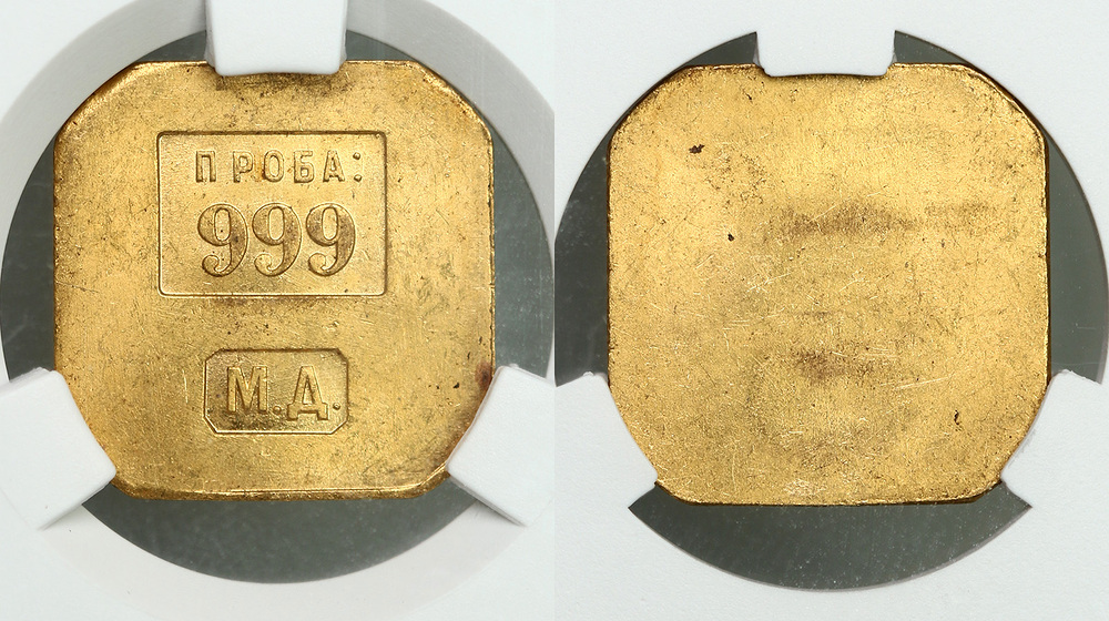 Редкий. Ленинградский монетный двор. Золото, 5,03 г. Федорин VI, Приложение, С. 495, 1. В слабе CPRC MS63. Наряду с производством монет на Ленинградском Монетном Дворе в 1925 году были отчеканены специальные золотые торговые восьмигранные слитки 999-й пробы с литерами «М Д». Предназначались они для реализации населению в период перехода к осуществлению новой экономической политики — НЭПу. Таких слитков было выпущено немногим более 150 тысяч штук. По весовой категории слитки подразделялись на три вида — 5 г, 10 г и 50 г.