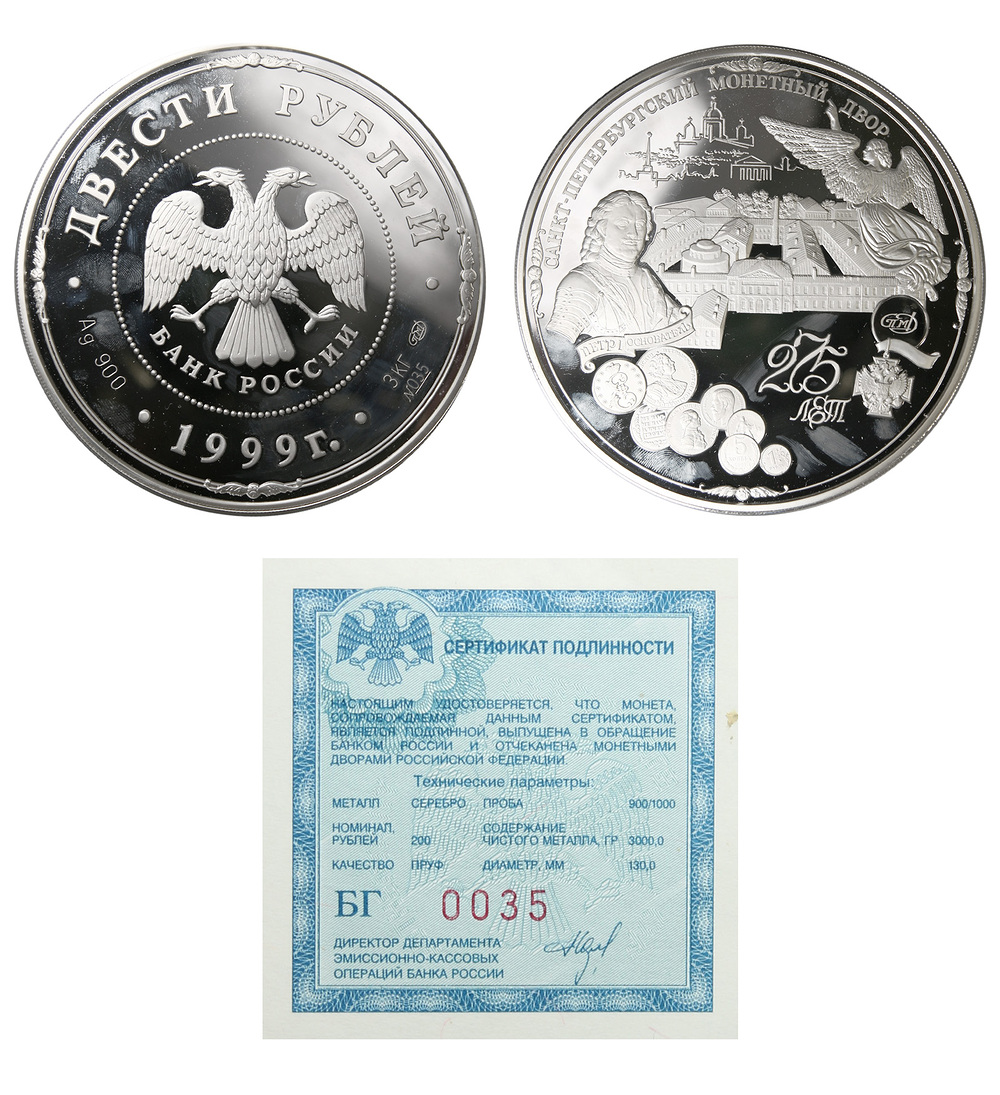 Очень редкая. Серебро, 96,7139 oz. 0,900. 3342 г. Санкт-Петербургский монетный двор. Диаметр: 130 мм. Тираж 150 экз. С сертификатом о подлинности № 0035. Первая монета подобного номинала и первый выпуск монеты, которая содержит 3 килограмма чистого серебра.
