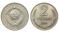 Ленинградский монетный двор. Справа от герба клеймо номера сплава – А21, слева цифра «2». Ушаков, Федорин #271 (Р-3) – приведено изображение данного экземпляра. Федорин VI, с. 437.7 (P-3) – приведено описание данного экземпляра. Происходит из коллекции Ю.А. Лебедева.