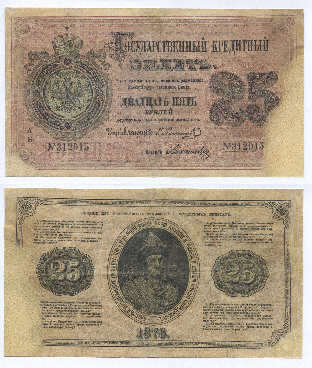 Государственный кредитный билет. 25 руб. 1876 г. А/Б № 312915 Ламанский/Лукашевич Фальшивый