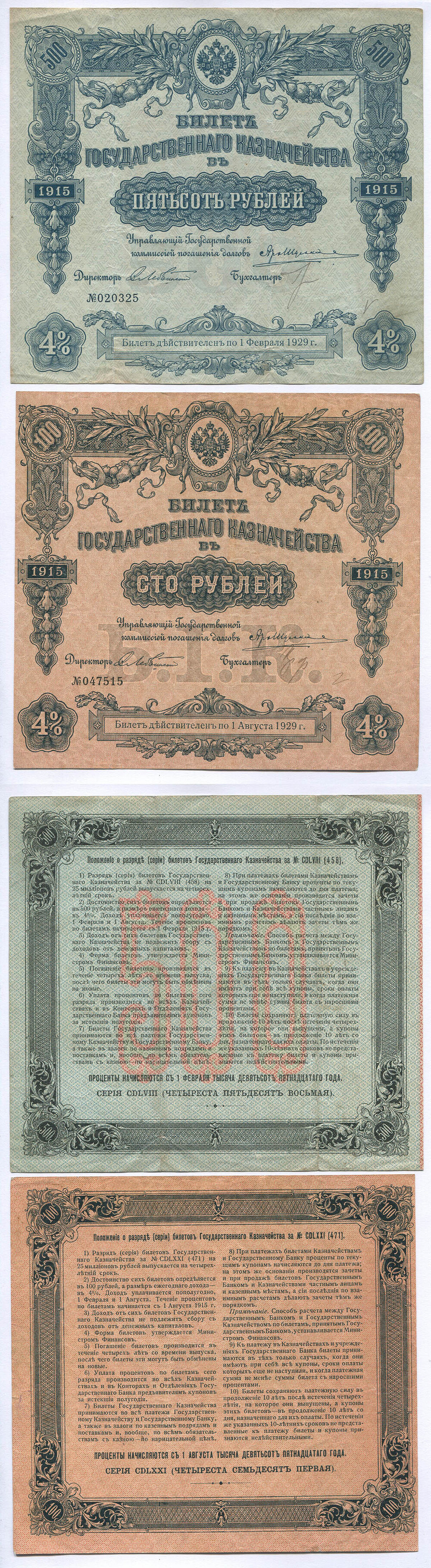 Групповой лот. Билеты государственного казначейства 100 и 500 руб. 1915 г. 2 шт.
