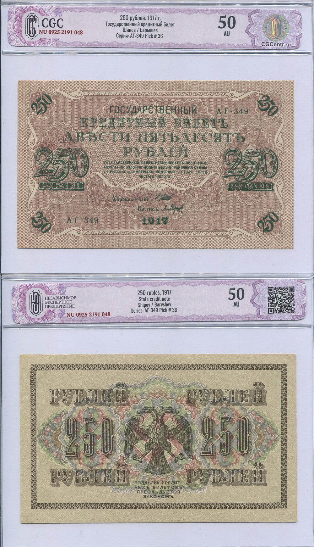 Временное Правительство. 250 руб. 1917 г. АА №E4.5 # АГ-349 Шипов/Барышев