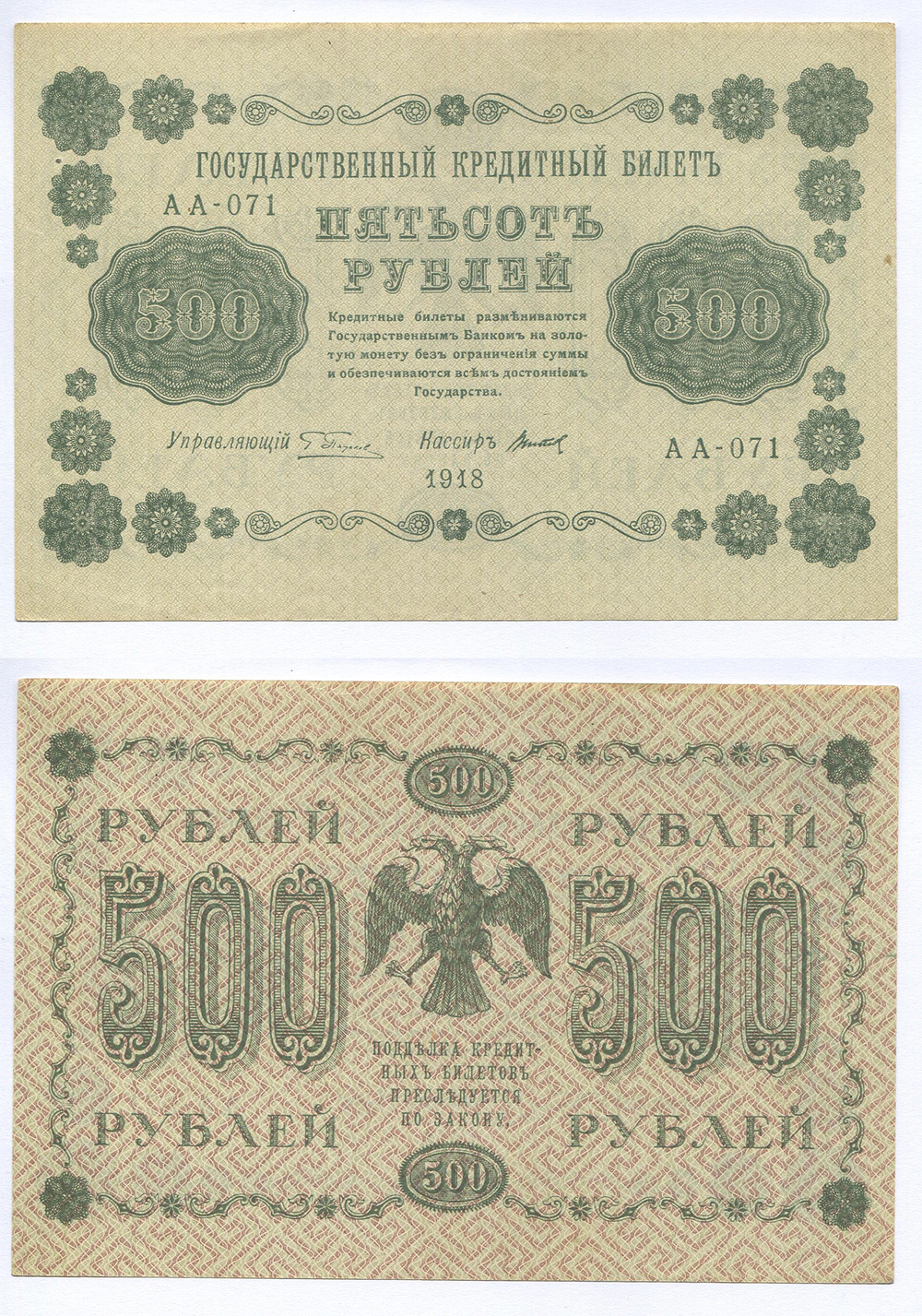РСФСР. Государственный кредитный билет. 500 руб. 1918 г. АА №E7.9a # АА-071 Пятаков/Титов