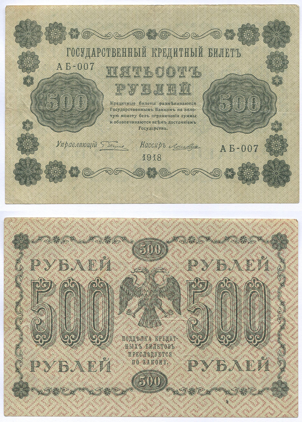 РСФСР. Государственный кредитный билет. 500 руб. 1918 г. АА №E7.9b # АБ-007 Пятаков/Лошкин