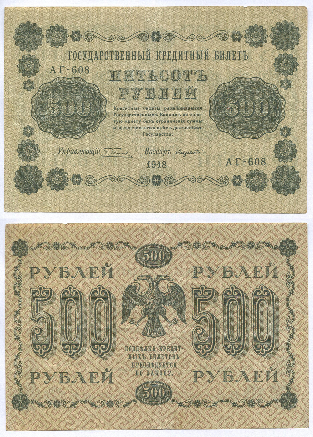 РСФСР. Государственный кредитный билет. 500 руб. 1918 г. АА №E7.9c # АГ-608 Пятаков/Лавровский