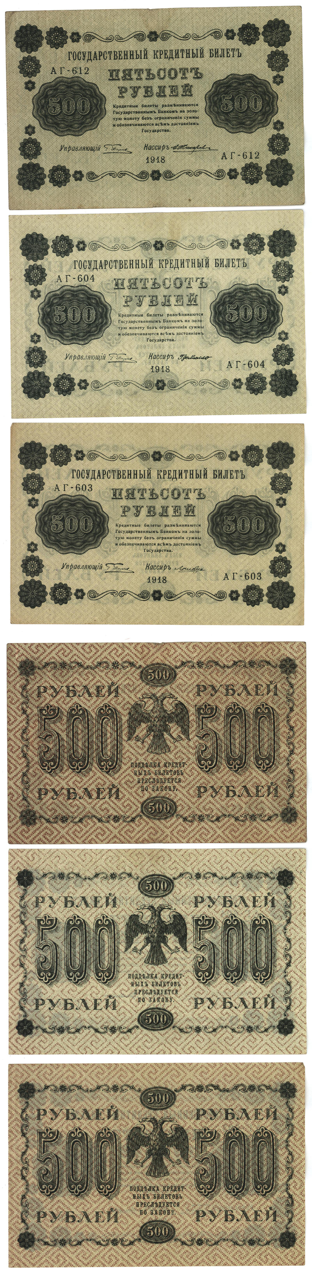 Групповой лот. РСФСР. Государственный кредитный билет. 500 руб. 1918 г. АА №E7.9c 3 шт.