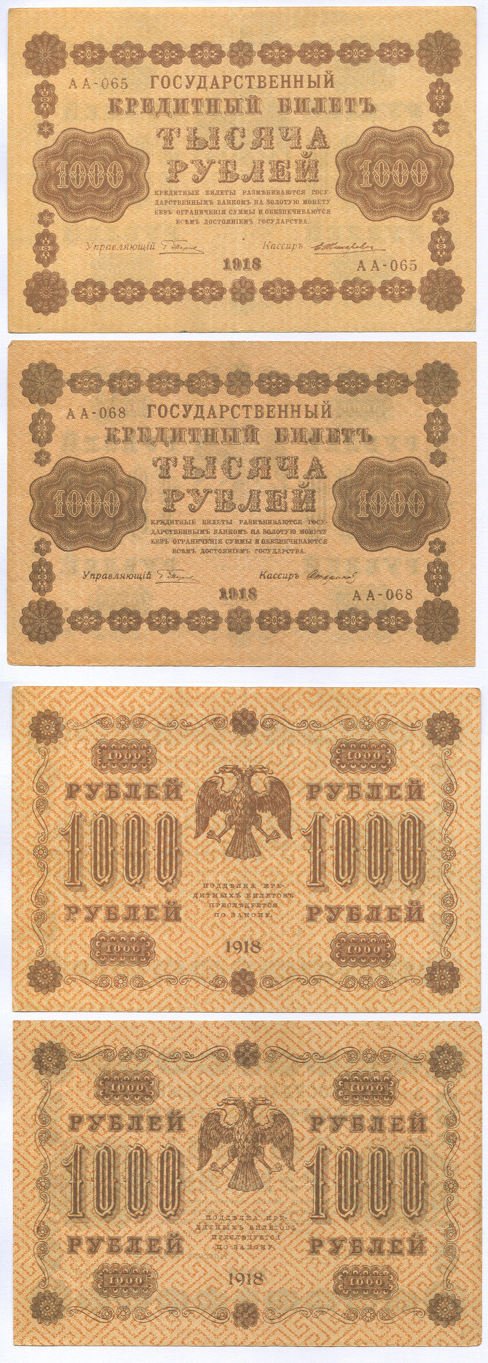Групповой лот. РСФСР. Государственный кредитный билет. 1000 руб. 1918 г. АА №E7.10a 2 шт.