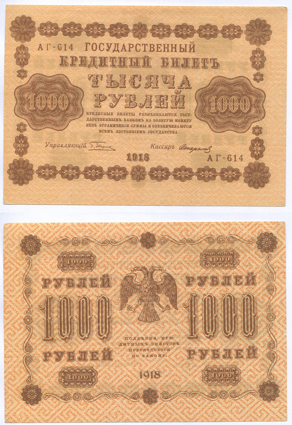 РСФСР. Государственный кредитный билет. 1000 руб. 1918 г. АА №E7.10d # АГ-614 Пятаков/Стариков