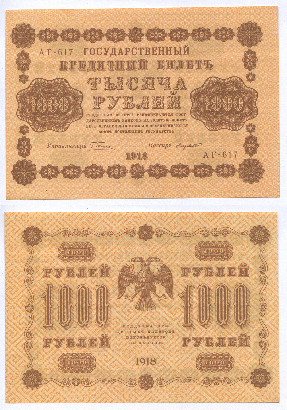 РСФСР. Государственный кредитный билет. 1000 руб. 1918 г. # АГ-617 Пятаков/Лавровский в/з вертикально