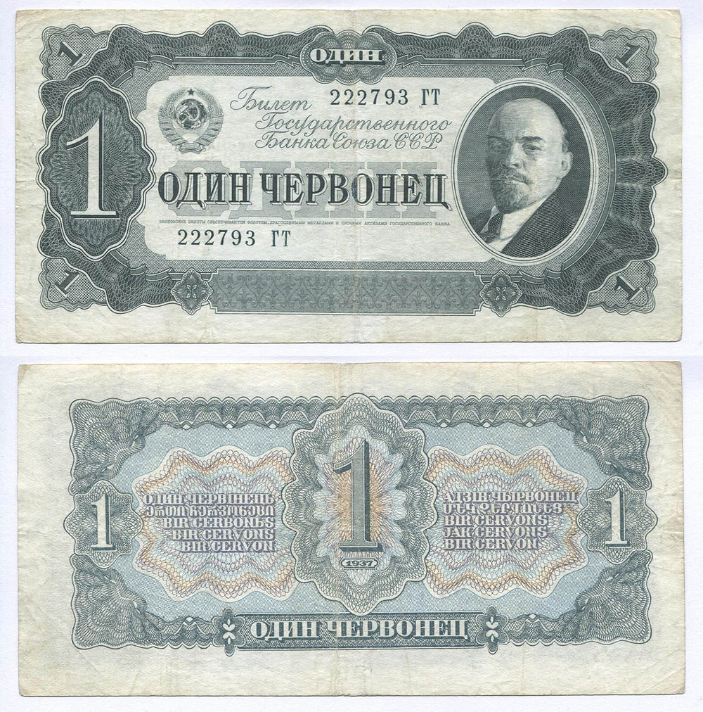 Билет Государственного Банка СССР. 1 черв. 1937 г. АА № U5.4 # 222793 ГТ