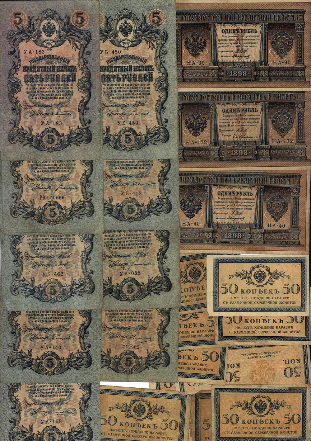 Групповой лот. Государственные кредитные билеты 50 коп, 1 и 5 руб. Шипов. 24 шт.