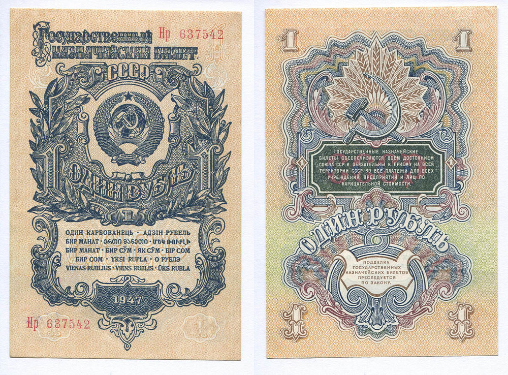 Государственный казначейский билет СССР. 1 руб. 1947 г. АА № U6.1 Нр 637542