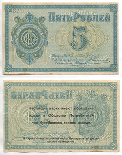 РСФСР. Расчётный знак. 5 руб. 1920 г. АА № Е9.2а Без в/зн квартблок