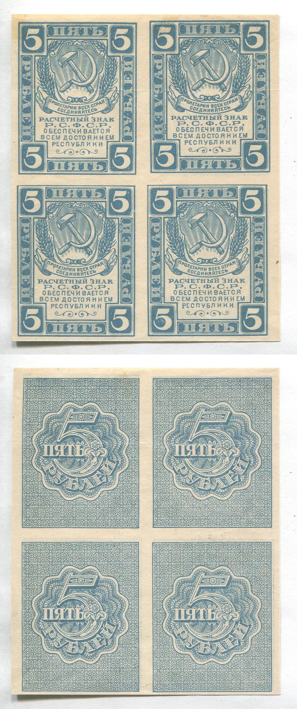 РСФСР. Расчётный знак. 5 руб. 1920 г. АА № Е9.2а Без в/зн квартблок