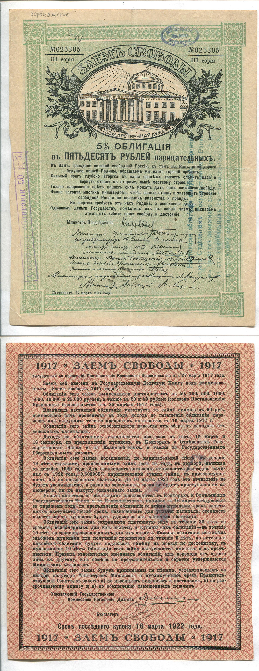Воронеж. Штамп ОГБ на Займе Свободы. 50 руб. Рябч.2 № 4333 # 025305