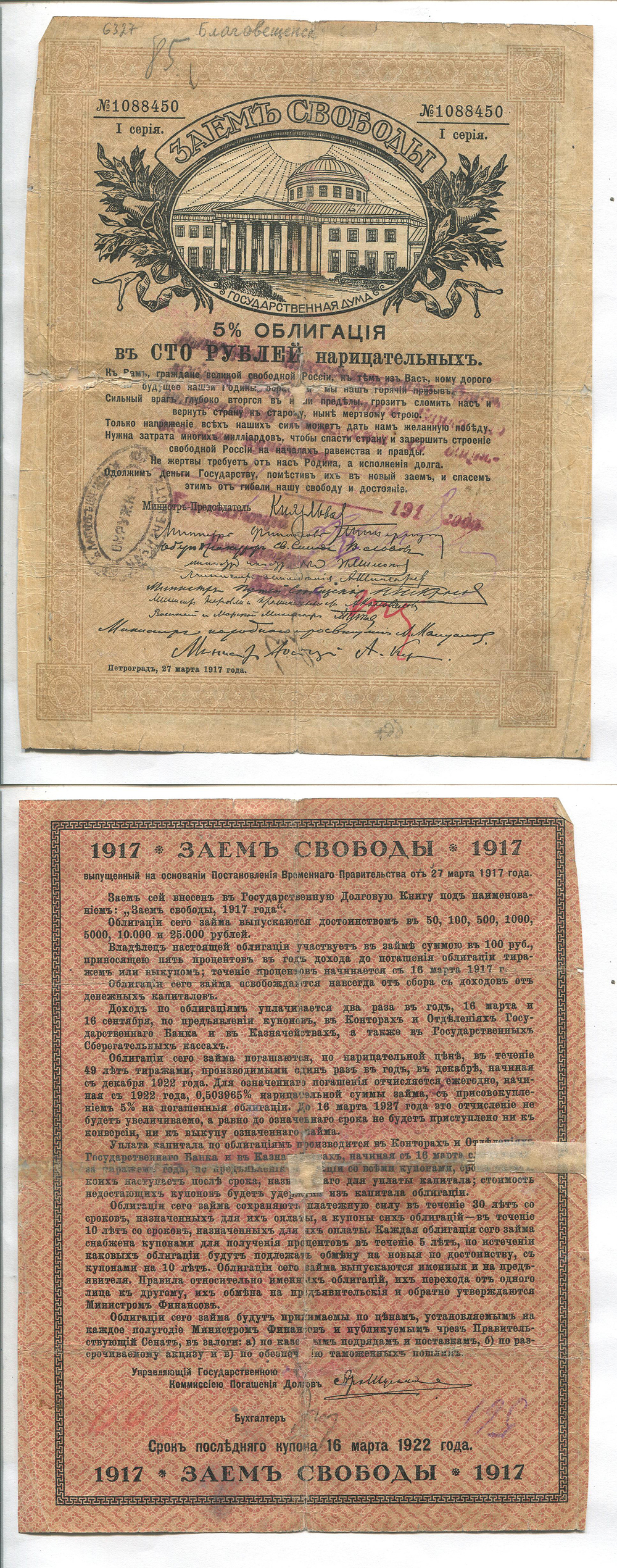 Благовещенск. Штамп О. Г. Б. на Займе Свободы. 100 руб. Рябч.2 № 10684 # 1088450