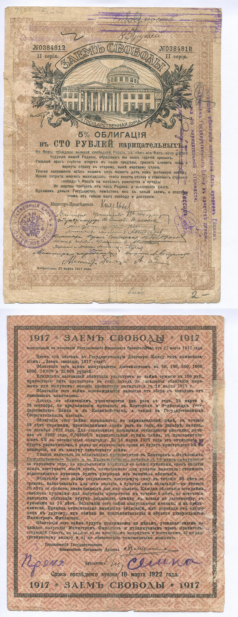 Ейск. Надпечатка ОГБ на Займе Свободы. 100 руб. Рябч.2 № 6089 # 0384812