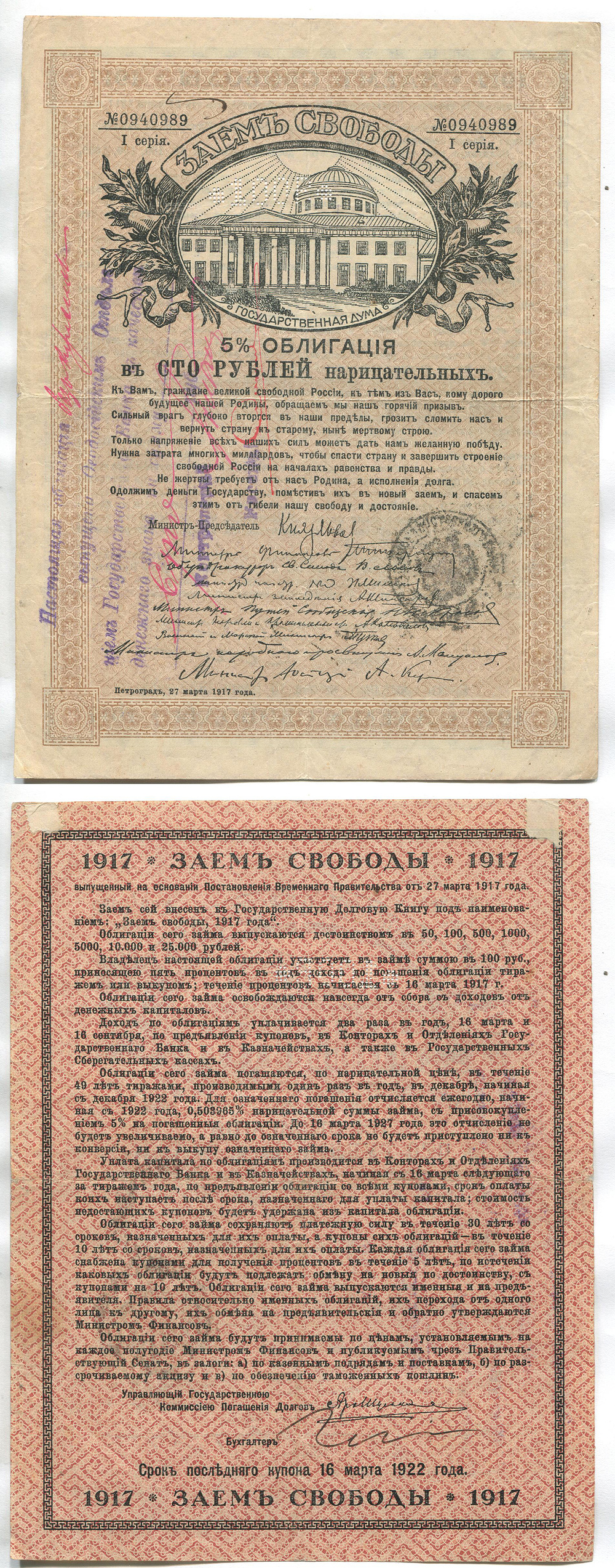 Феодосия. Штамп О. Г. Б. на Займе Свободы. 100 руб. Рябч.2 № 18645 # 0940989