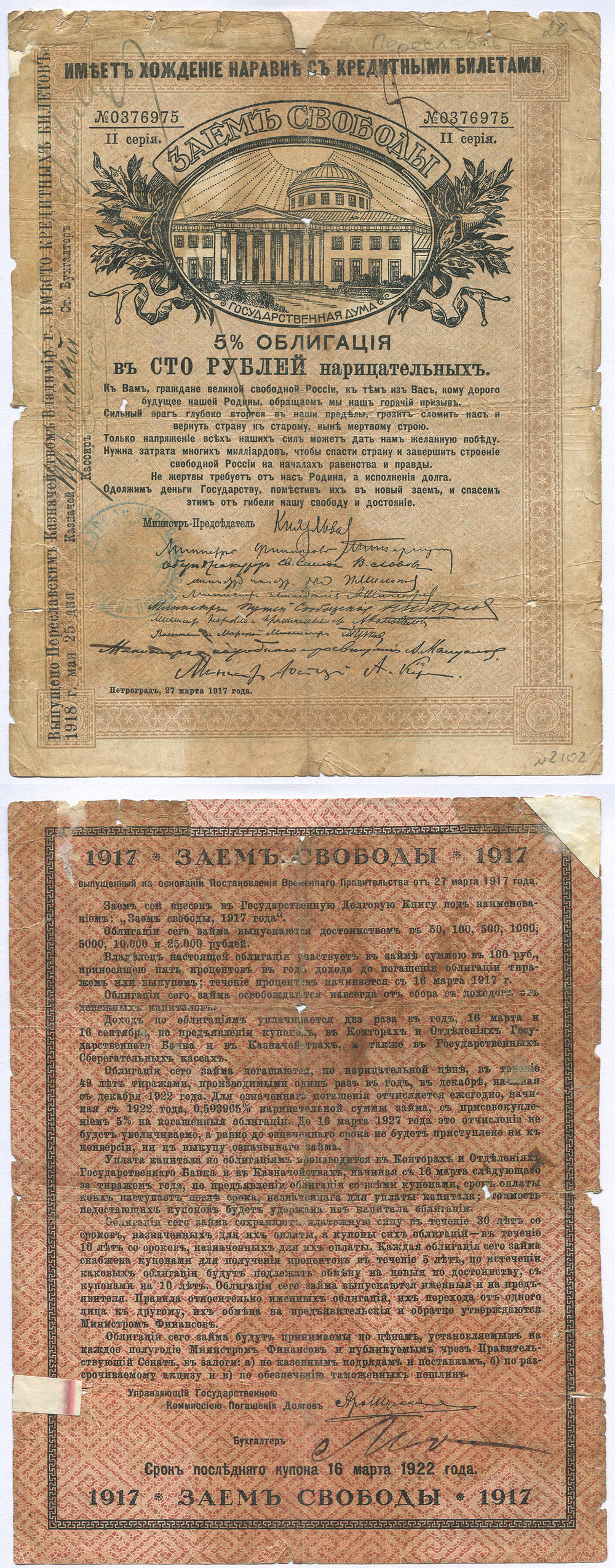 Переславль-Залесский. Штамп О. Г. Б. на Займе Свободы. 100 р. Рябч.2 № 3478 # 0376975