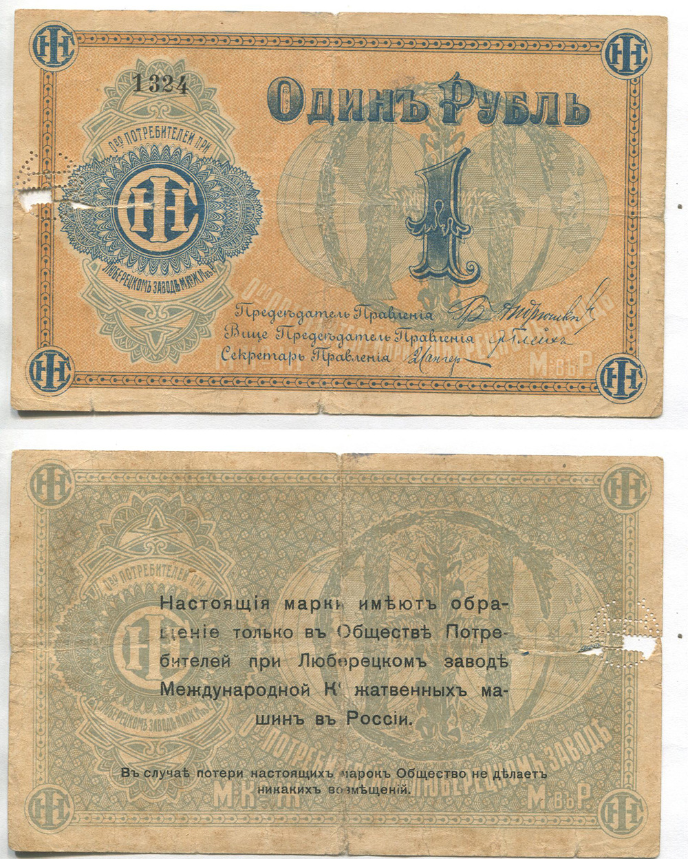 Люберцы. Общество потребителей при заводе жатвенных машин. Марка. 1 руб. Рябч.2 № 3260 # 1324