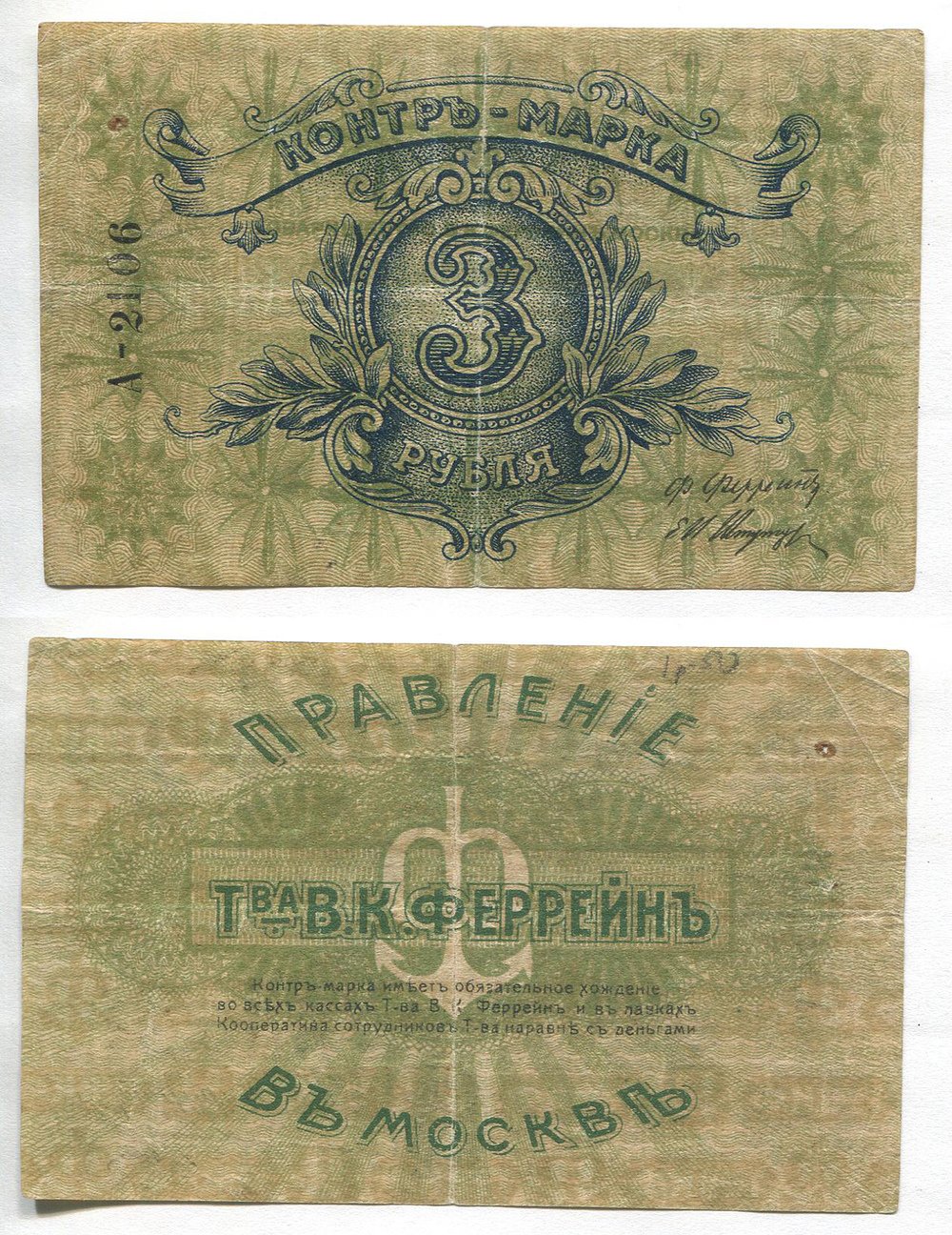 Москва. Правление товарищества В. К. Феррейн. Контрольная марка. 3 руб. Рябч.2 № 3306 # А-2106