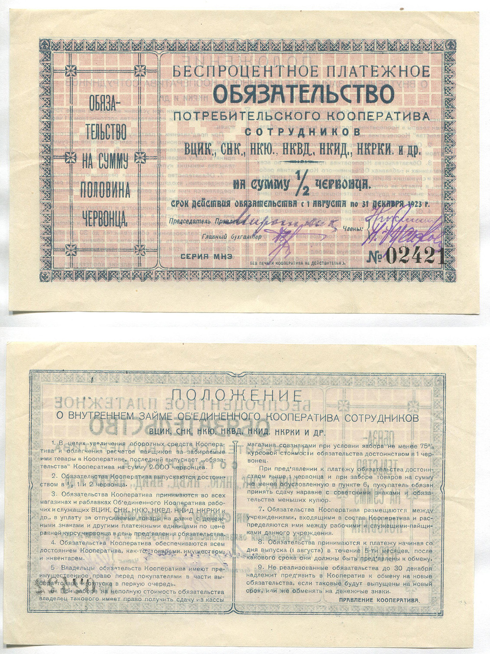 Москва. Потреб. Кооператив Сотрудников НКВД. Обязательство. 1/2 червонца. Рябч.2 № 3359 # 02421
