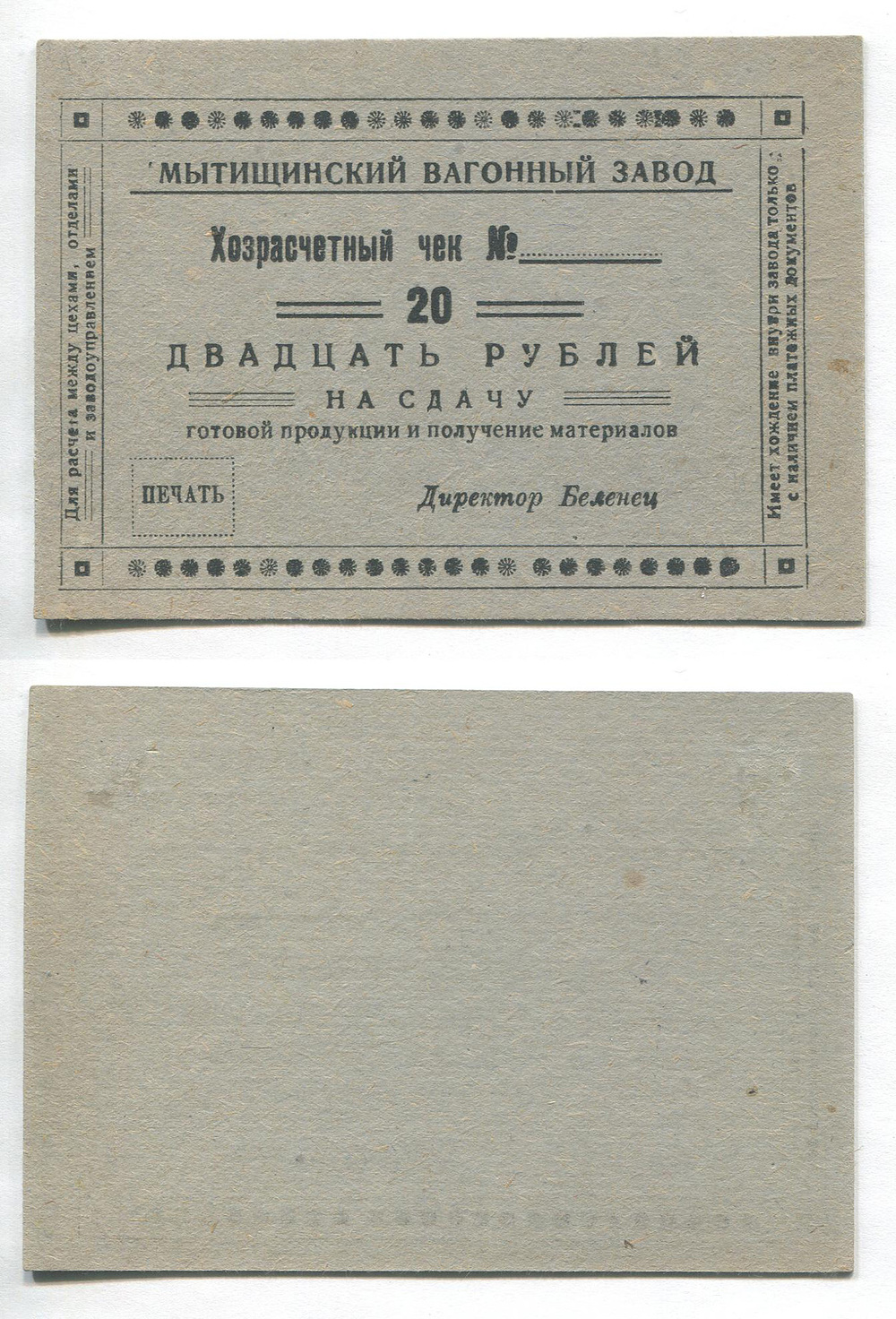 Мытищи (Московской губ.). Вагонный завод. Хозрасчетный чек. 20 руб. Рябч.2 № 3435