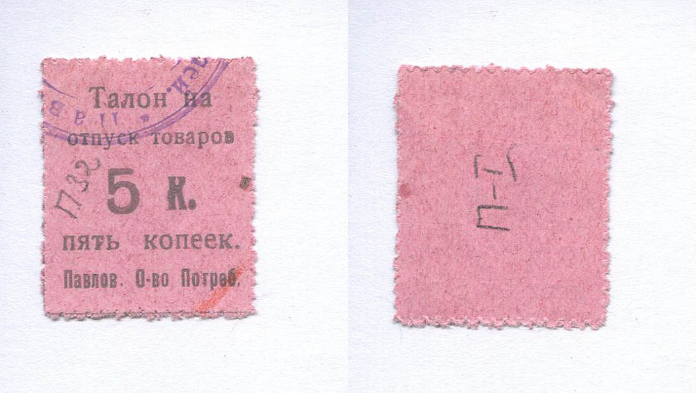 Павлово (Нижегородская губ.) О-во потребителей. 5 коп. Талон на отпуск товаров.