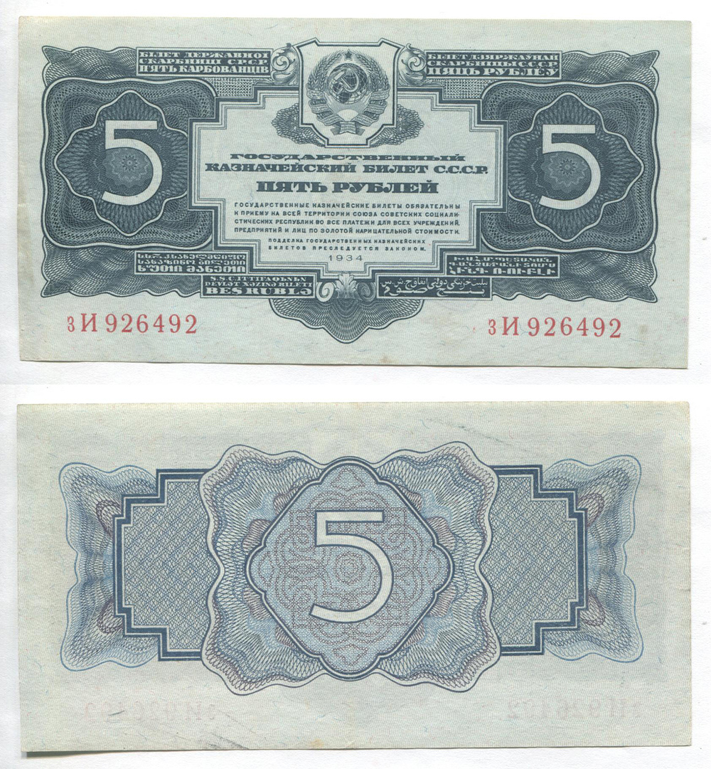 СССР. Государственный казначейский билет. 3 руб. 1934 г. АА№U4.2.2 # зИ 926492 Без подписи