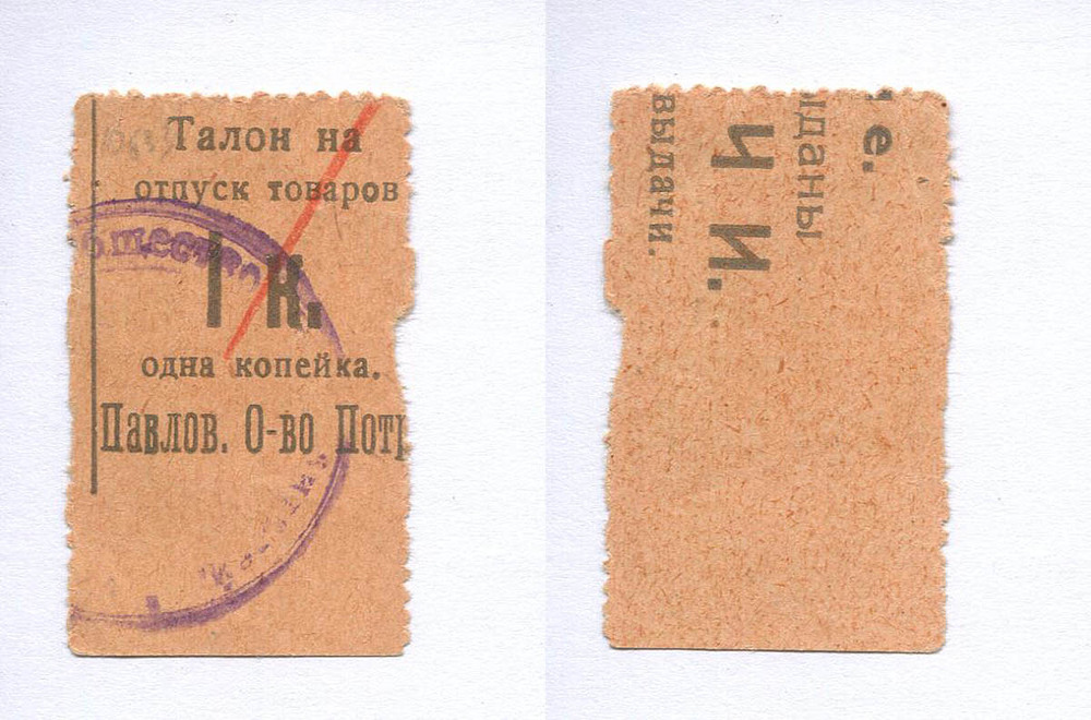 Павлово (Нижегородская губ.) О-во потребителей. 1 коп. Талон на отпуск товаров. оранжевая