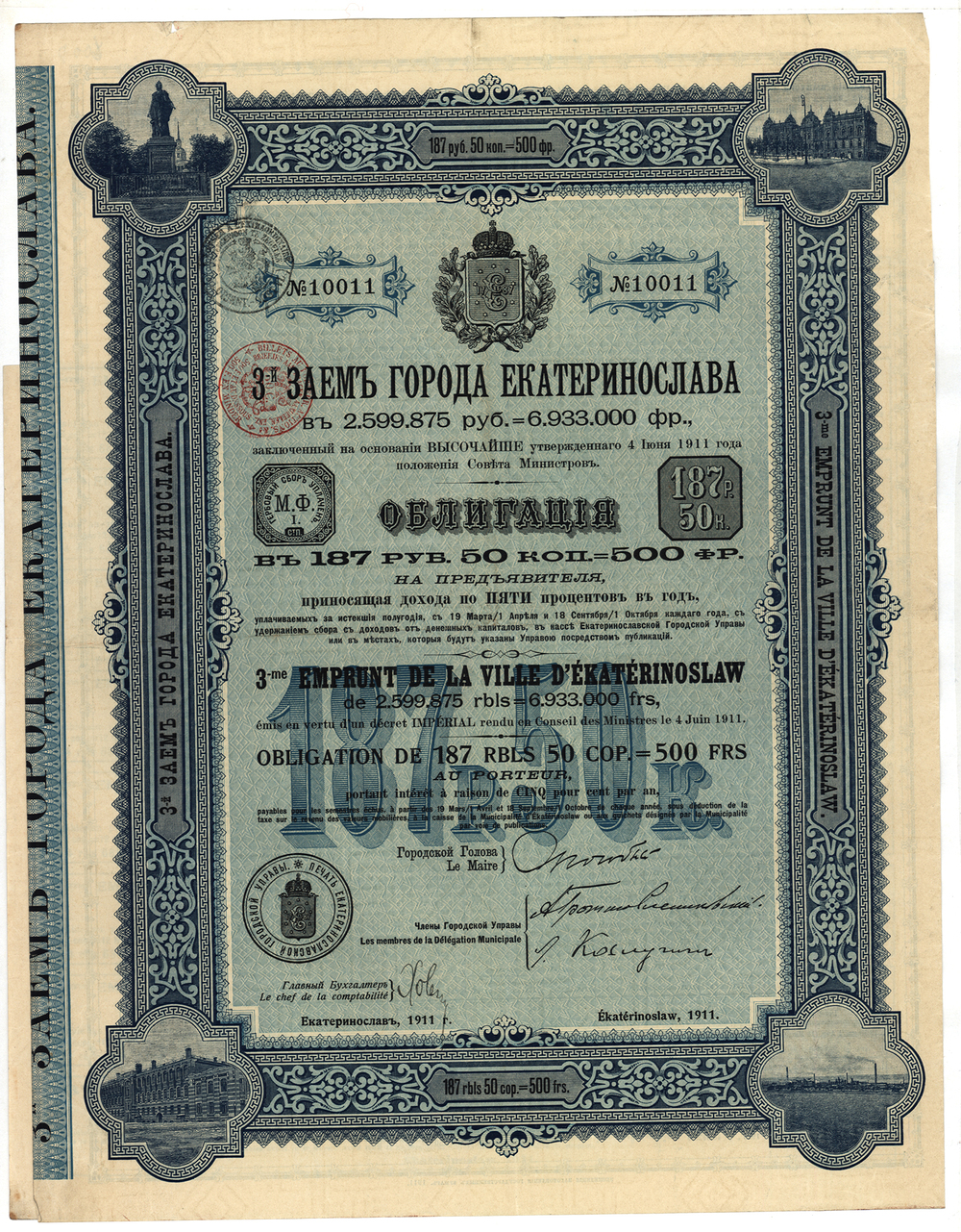 Екатеринослав. Городской заем. 187 руб. 50 коп. 1911 г. № 10011