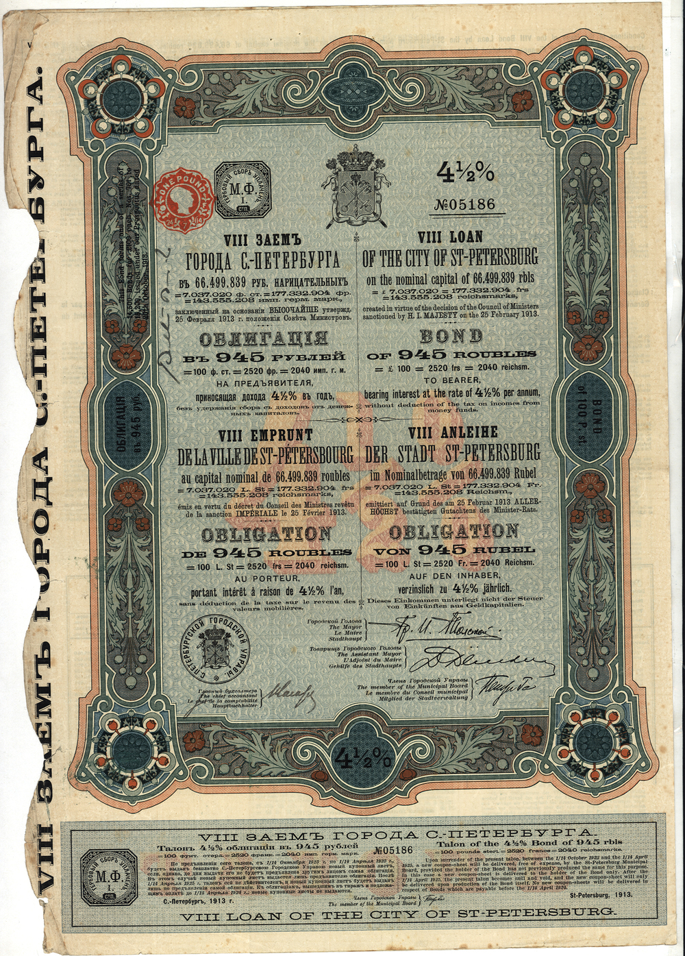 С-Петербург. 8-й городской Заём. Облигация. 945 руб. 1913 г. # 05186
