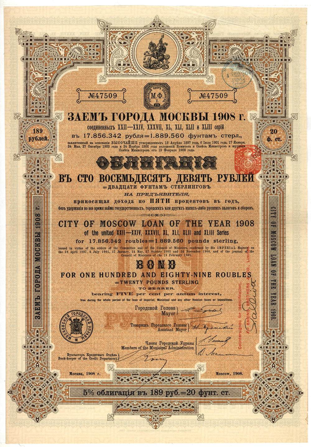 Облигация. Москва. Заем 1908 г. 5%. 189 руб. 1908 г. № 47509