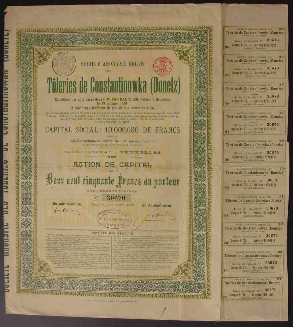 Акция. Константиновка (Донецкий бассейн). АО Полотняной фабрики. 250 фр.