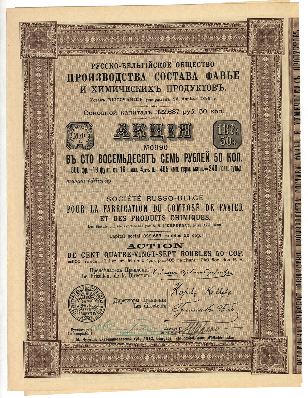 Русско-бельгийское О-во произ-ва состава Фавье и химических пр. Акция. 187 руб. 50 к. 1899 г. №0990