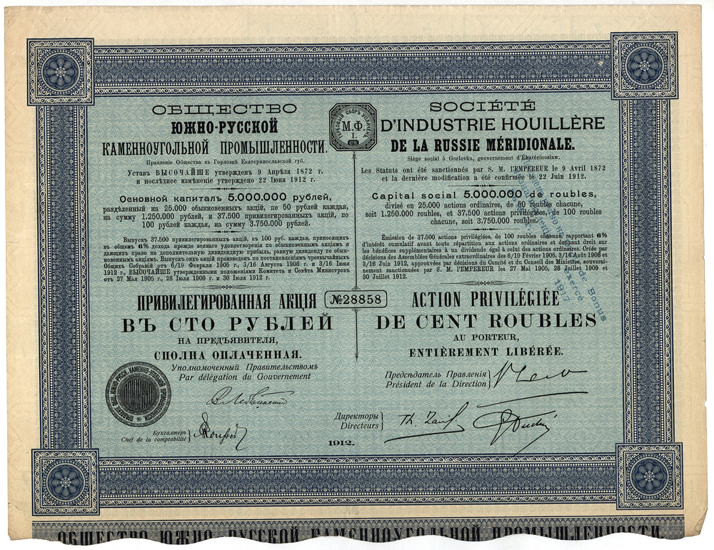 Общество Южно-русской каменноугольной промышленности. Акция. 100 руб. 1912 г. № 28858