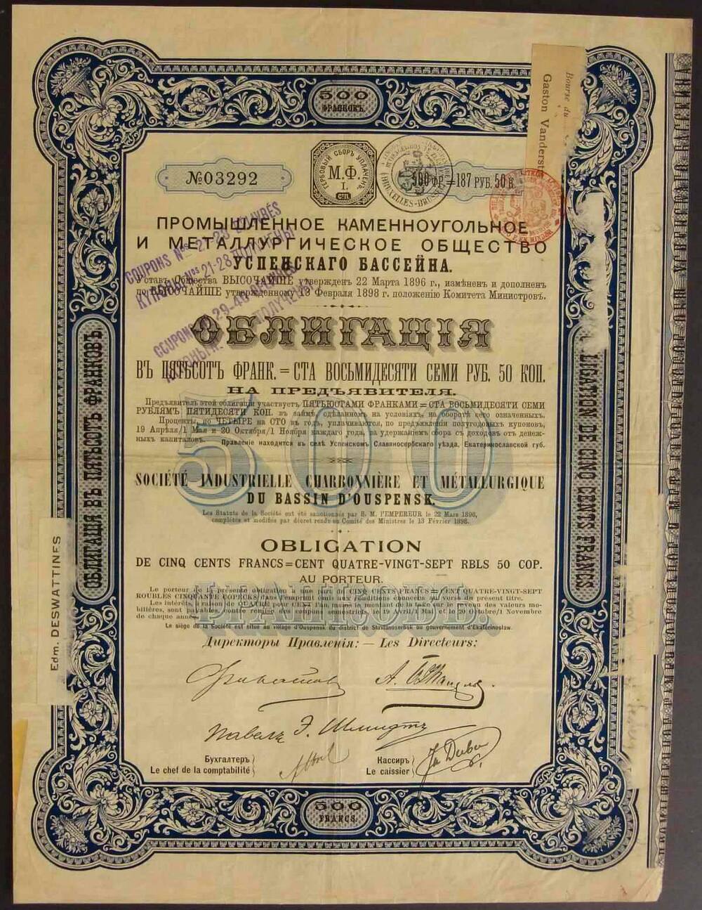 Успенский бассейн. Промышленное каменноугольное и металлургическое о-во. 4% облигация в 187 руб. 50коп.