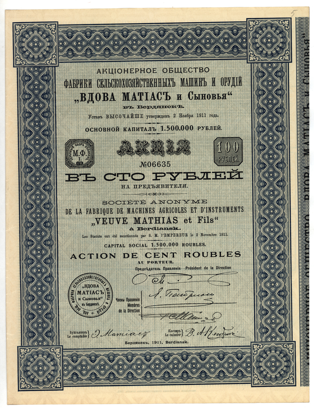 Акция. Бердянск. АО "Вдова Матиас и Сыновья". 100 руб. 1911 г. № 06635