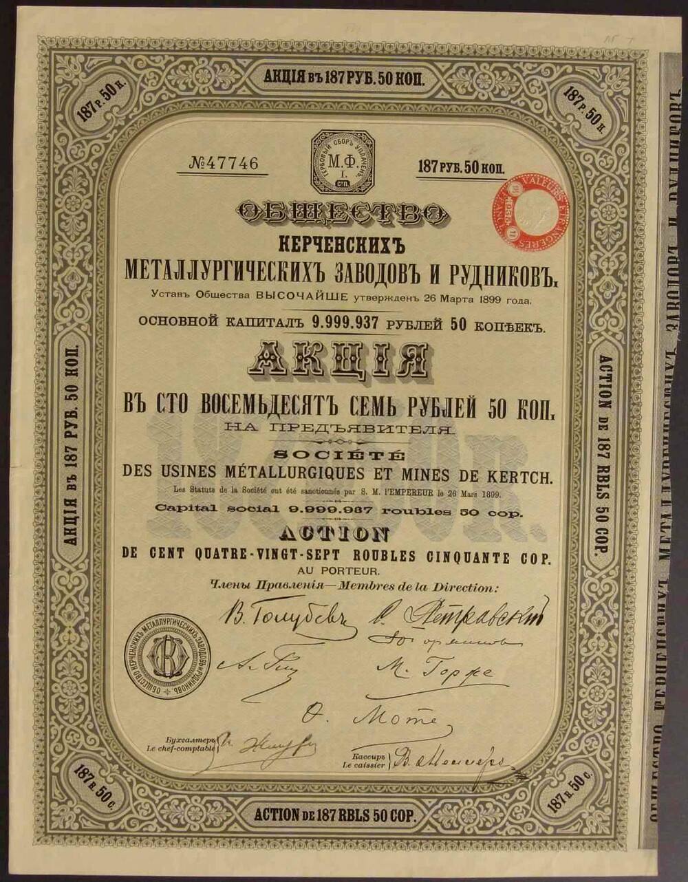 Акция. Керченские металлургические заводы и рудники. Акция в 187 руб. 50 коп.
